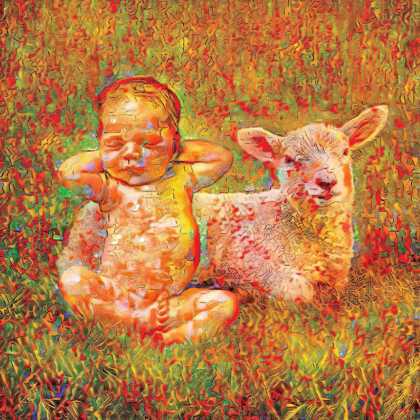 [Fig. 3] Kid and Lamb in a Field. Artwork realized on a metal plate measuring 100 x 100 cm. The image is created by fusing a large number of different AI-based transformations of a photographic collage into one new image. Credits: Jeroen van der Most.